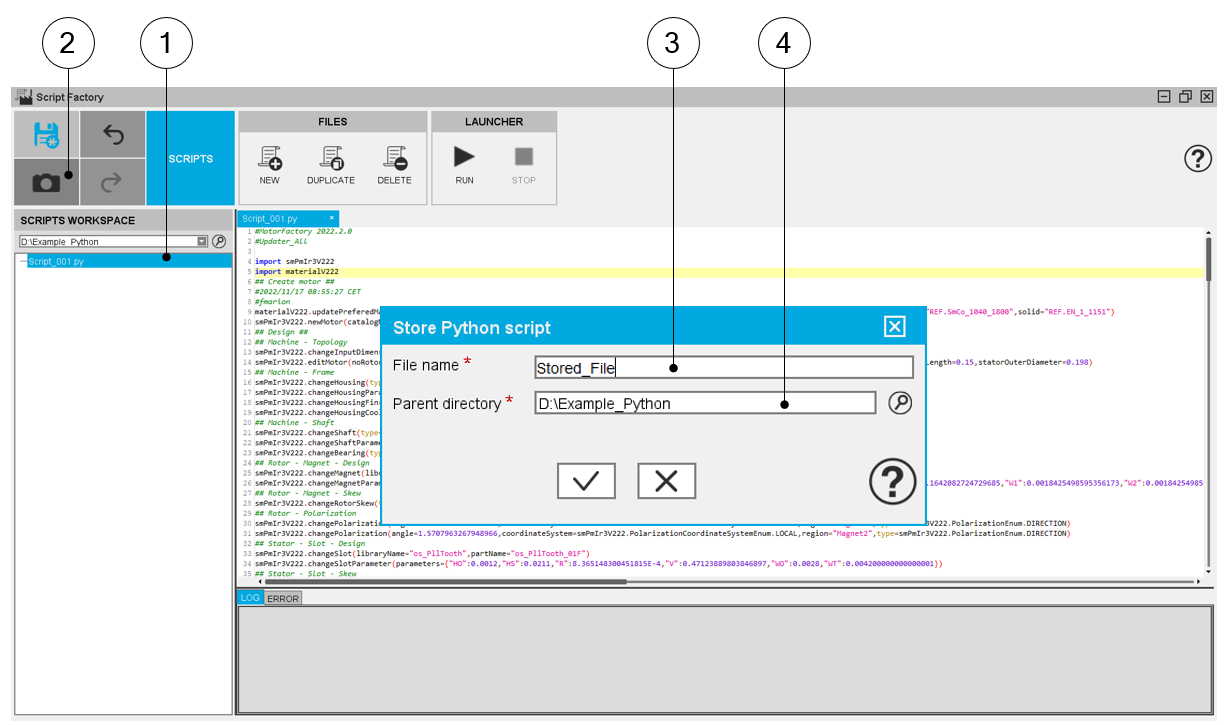 In Script Factory application, a selected python file from the workspace tree can be stored.
