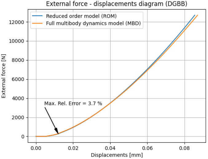 Like the DGBB example, the maximum error is identified again in the lower range of the external load, which is less than 4%. Furthermore, the two models correlate very well, even above the static load rating.