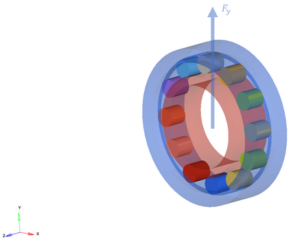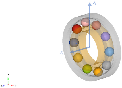 The MBD representation defines both bearing rings (inner and outer) and each rolling element as a rigid body with an accurate graphical representation. Rigid body contact is defined between the graphics of every rolling element and the two bearing rings. The cage, what keeps the rolling elements in place, is replaced by kinematic constraints to keep the distance of the rolling elements constant during rotation.