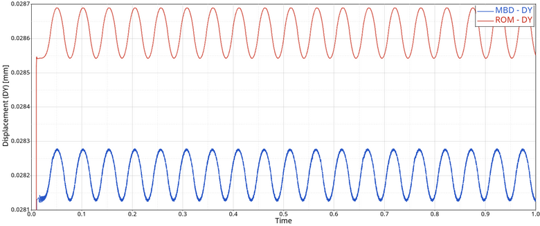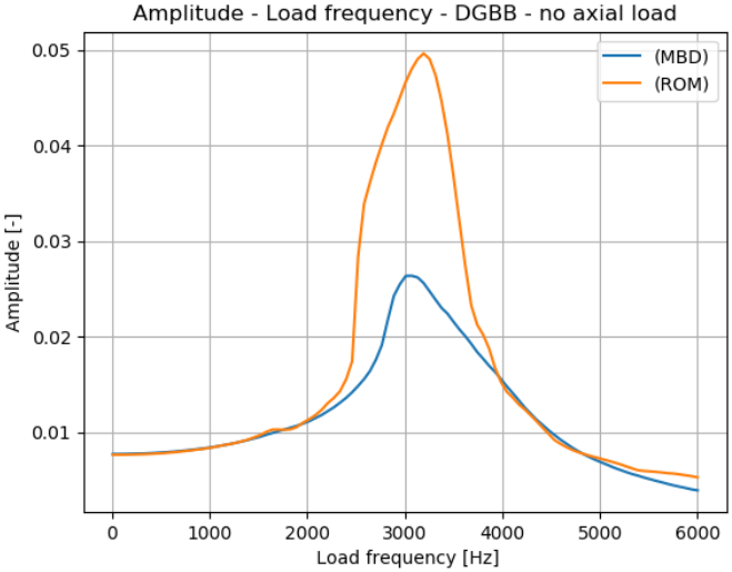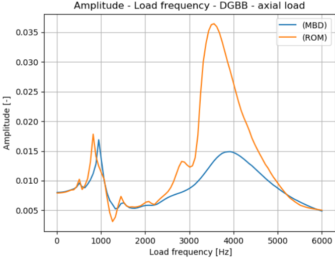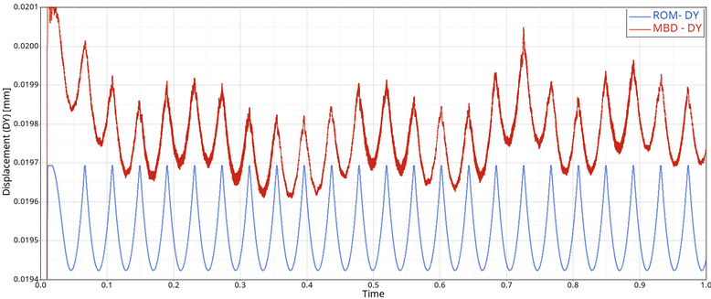 Both models, ROM and the full MBD model, show an oscillation with the same frequency that is caused by the rolling elements passing through the loading zone. Although the ROM model does not include rolling element parts, their theoretical move is calculated inside the force subroutine of the machinery bearings. Here, this calculation is clearly validated.