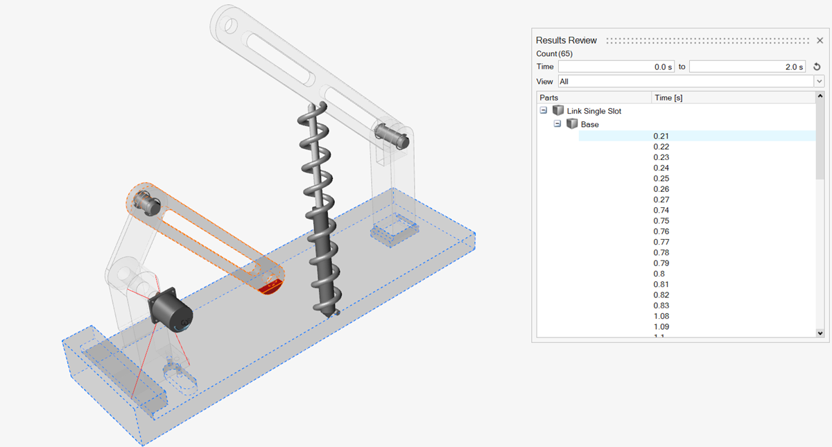Monitor the distance between two parts during the simulation. The endpoints of the proximity measurement are color