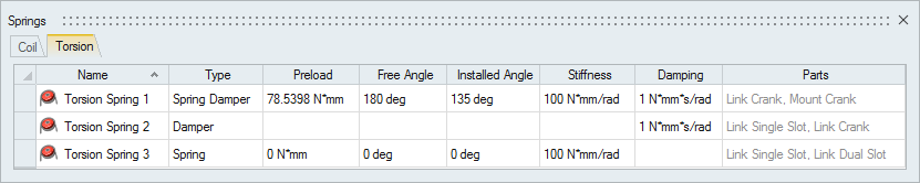 The Springs table lists all of the coil and torsion springs in your model and allows you to edit various attributes. Click the Torsion tab to view torsion springs.