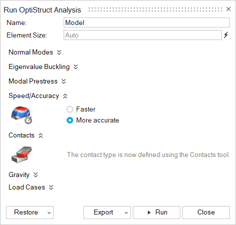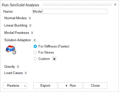 解析の実行ウィンドウのオプションを使用して、解析を定義します。オプションは、SimSolidソルバーが選択されているか、OptiStructソルバーが選択されているかどうかによって異なります。