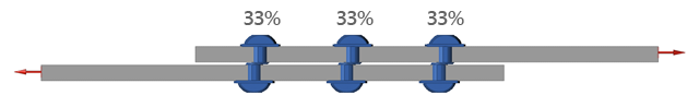 実際の締結においては、実際の荷重はこれら極限値の間を取ります。たとえば、中心のリベットに30%、両端のリベットにそれぞれ35%の荷重が伝達されます。