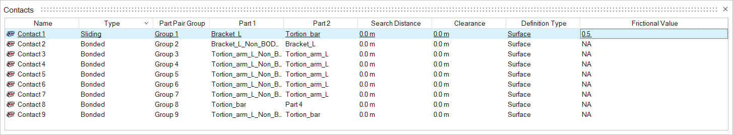 “接触”表格列出了模型中的所有接触,其中包括连接的类型及其所连接的零件。