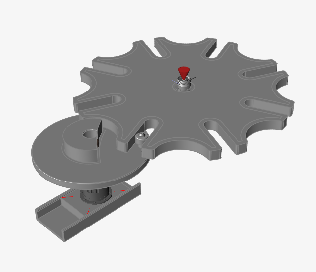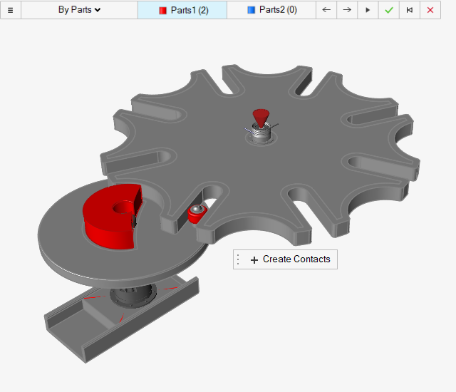 在三个零件之间创建运动接触 点击运动接触工具。 点击凸轮零件。 该零件会变成红色,Parts1 按钮现在的计数为 (1) 个零件。 点击打锤零件。 该零件会变成红色,Parts1 计数会递增至 (2)。 点击 Parts2 按钮。 点击槽轮装配外围的槽轮分割 2 零件。 该零件会变成蓝色,Parts2 按钮现在的计数为 (1) 个零件。 点击 按钮。此时即会创建一个接触(如功能区计数器所示),并会进入编辑模式。 鼠标右击划过勾选标记以退出,或双击鼠标右键。