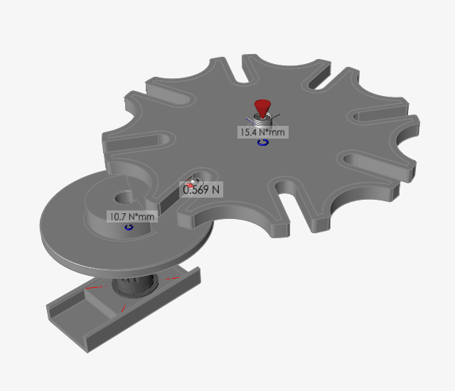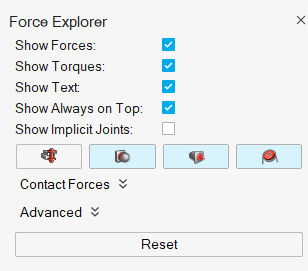 使用“力浏览器”查看运动分析结果 在对应字段中输入数值或拖动滑动条,将动画工具栏中的时间更改为 0.30 s。 点击“运动”功能区中的运行,然后点击力浏览器。 此时会弹出“力浏览器”。要移动“力浏览器”,点击标题区域并拖动至图形区域。 按 F 键让模型适应视图。 按动画工具栏上的播放按钮。当槽轮围绕其轴转动时,请注意转动电机和扭力弹簧中的接触力和扭矩如何变化。 在“力浏览器”中,选中或反选一些复选框和实体按钮,试试其他一些高级选项。 在“力浏览器”中,点击重置按钮,以恢复默认设置。 在模型视窗双击右键退出复查模式,但要注意力浏览器会保持可见 — 这也符合我们的需要。