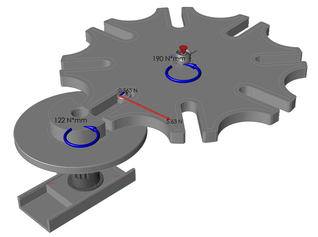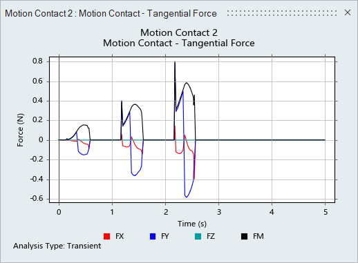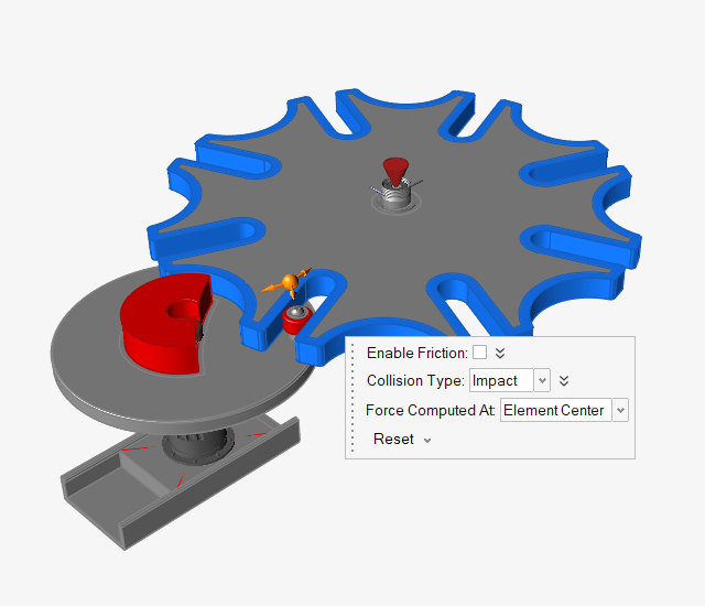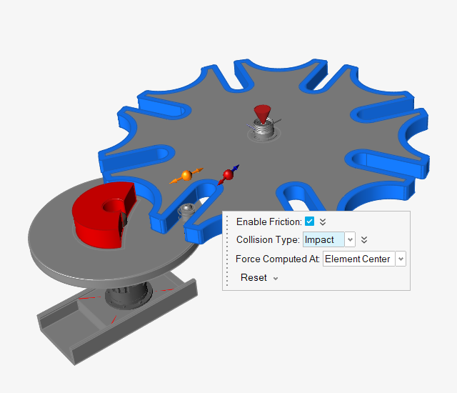 运行运动分析并为结果添加动画效果 点击“分析运动”工具上的快速运行按钮,查看运动中的模型,并让分析运行完成。 接触区域的力矢量现在可以使用笔直的蓝色箭头指示切向分量(代表摩擦),法向力分量则显示为红色。