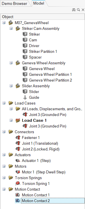 打开 Altair Inspire 模型 按 F7 打开“演示浏览器”。 双击 Motion 文件夹下的 M07_GenevaWheel.stmod 文件,将其加载到模型视窗中。 按 F2 键打开“模型浏览器”。 确保在“偏好设置”中将模型单位设置为 MMKS (mm kg N s)。您还可以在偏好设置中更改显示单位。