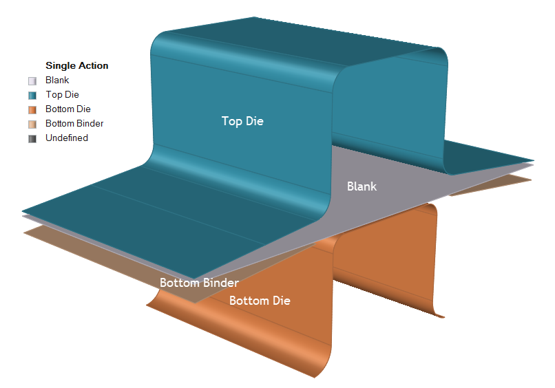 Add a Single Action Draw Operation Simulate a bottom binder holding the blank of a model while the top die deforms the blank against the bottom die. The default tools associated with Single Action draw include a top die, bottom die, and bottom binder. From the Tryout ribbon, click the Add operation icon. From the Add Operation window, select Single Action. The Single Action draw operation is added to the Tryout ribbon. Click the Single Action draw operation. The default tools are displayed. Configure the tools for the Single Action draw. Figure 1. Model Set Up for a Single Action Draw