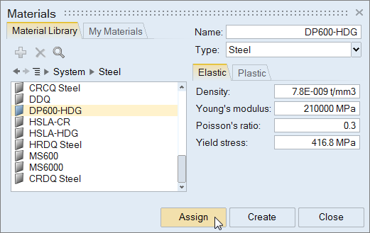 - In the Materials window on the Material Library tab, select the material DP600-HDG.