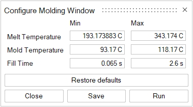 金型温度、溶融温度、および充填時間の最小値と最大値をカスタマイズするには、成形ウィンドウの設定ツールを使用します。