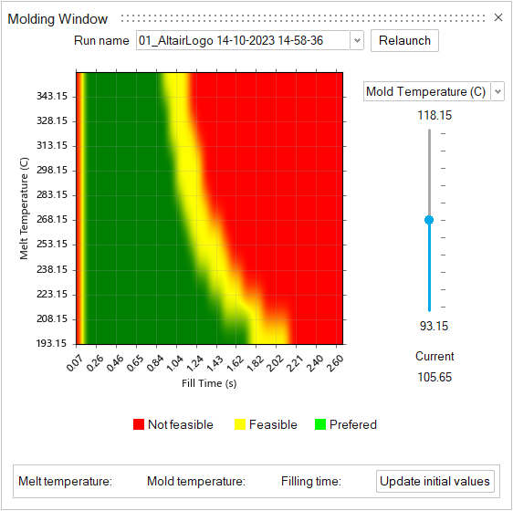 成形ウィンドウを使用して、モデルに最適な金型温度、融解温度、および注入時間を計算します。