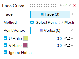注: UとVのオプションの横の色は、それぞれの方向のカーブの色を示します。U方向のフェイスカーブは黄色で表示され、V方向のフェースカーブはマゼンタで表示されます。