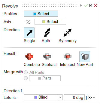 をクリックします。結果タイプを変更する マイクロダイアログまたはガイドパネルで結果タイプを選択します: - 和:回転した形状を既存パートと結合します。
