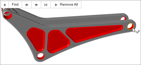 穴ツールを使用すると、穴またはポケットを選択して、そのサイズより大きい、小さい、または同程度(±5%)のものをすべて見つけることができます。また、外側のフェイス方向に、上方検索して関連付けられた穴またはポケットのチェーンを特定します。