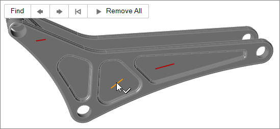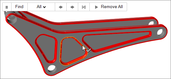 ラウンドツールを使用すると、1つのラウンドまたはフィレットを選択して、そのサイズより大きい、小さい、または同程度(±5%)のラウンドまたはフィレットをすべて見つけることができます。また、チェーンラウンドまたはフィレットの特定も行えます(ただし、特定されたすべてが一度に完全に削除されない場合もあります)。一般に、まず小さなフィレット、次に大きなフィレット、最後にラウンドを削除することをお勧めします。これ以上削除できないところまで進んだら、他のモデリングツールや方法を使用して形状の簡素化を完了することをお勧めします。