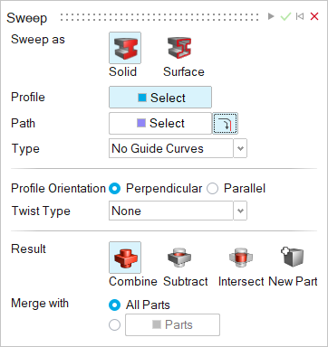 パスに沿ってプロファイルをスイープし、ソリッドまたはサーフェスを作成します。新規パートを作成したり、スイープた形状を既存のパートと結合、減算、交差させたりすることができます。