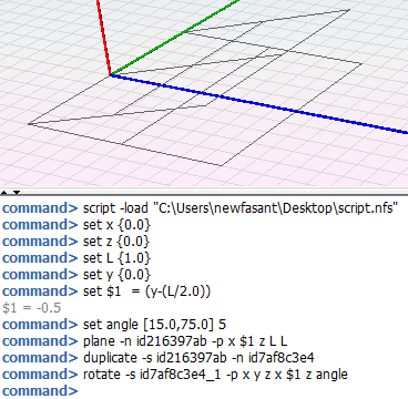 - Fourth step Script visualization. Open the exported .nfs file with a text editor to visualize its content. Note that a new parameter (named $1) has been automatically generated for saving a mathematical operation. Edit the angle parameter, for example, change it from" [45.0,315.0] 7" to "[15.0,75.0] 5".