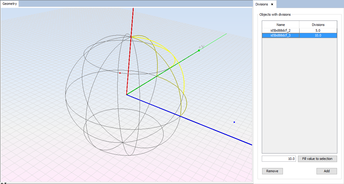 This option opens a table list with all the names of the objects that are going to be meshed with a different number of divisions than the meshing configuration together with the value of its divisions. Selecting the objects on the geometry panel and clicking on Add button, the object names will be added to the Objects with divisions list and then the number of divisions for it may be edited. To edit the number of divisions of a given object, select its row, introduce the desired number of divisions in the field left to the Fill value to selection button, and then click on the button. Use the Remove button to delete objects from the divisions' table.