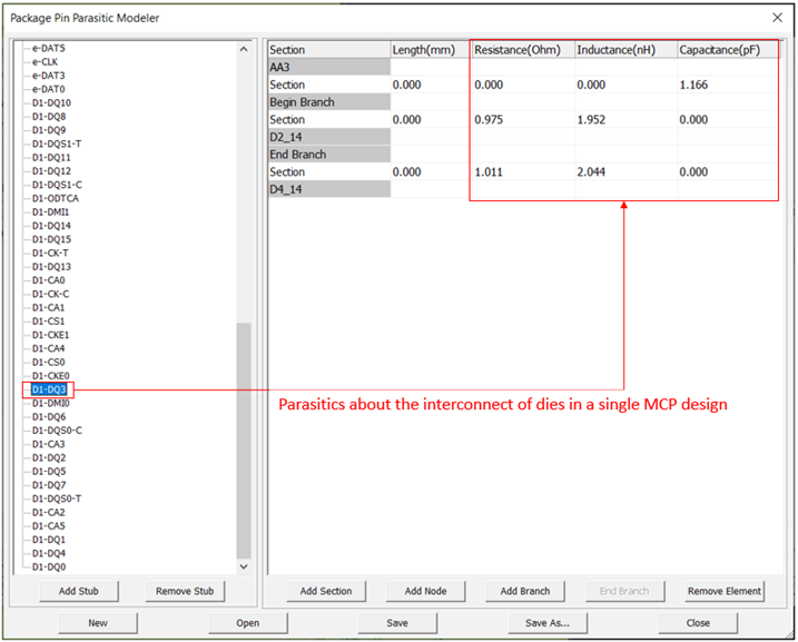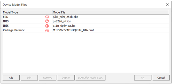 After selecting *.pmf in the Device Model Files menu and clicking Display, you can see the Package Pin Parasitic Modeler dialog. Users can check the parasitic information for each pin, which is described in the [Path Description] section inside the *.ebd file.