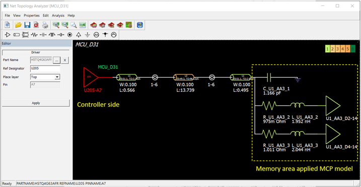 After completing the basic setup and opening the Net Topology Analyzer dialog, users can see the circuit configuration of the Controller side and the Memory area where the MCP model is applied. Users can confirm the pin package parasitic values in the model marked with yellow dotted lines. The figure below shows the MCP simulation model reflected with the parasitics of [Path Description] D1-DQ3 as indicated in the Package Pin Parasitic Modeler above.