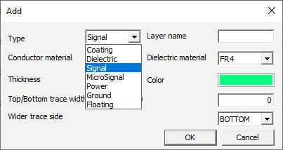 - Dielectric: Dielectric layer between two conductor layers. Multiple dielectric layers can be placed next to each other