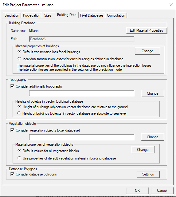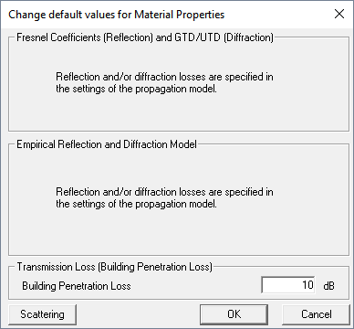 If the individual properties are not defined in the database or if the user does not want to use the material properties defined in the database, default values can be used by enabling Default transmission loss for all buildings. In this case, all buildings are assigned the same building penetration loss independent of the definitions in the database (individually defined properties are not taken into account, for all buildings the same material properties are used). The default value can be changed by using the Change button.