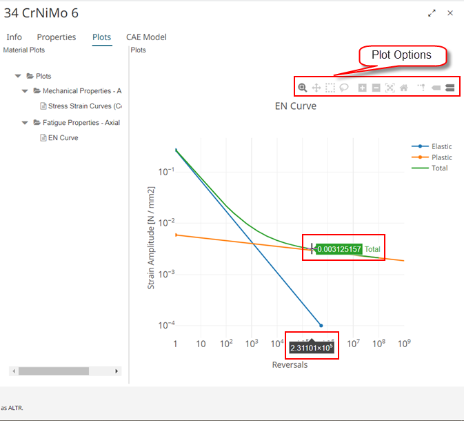 The selected material data is displayed as a plot.Hover over the plot, as you move the cursor, the X and Y values are displayed.