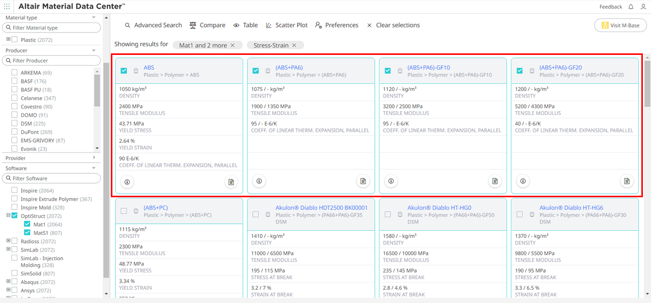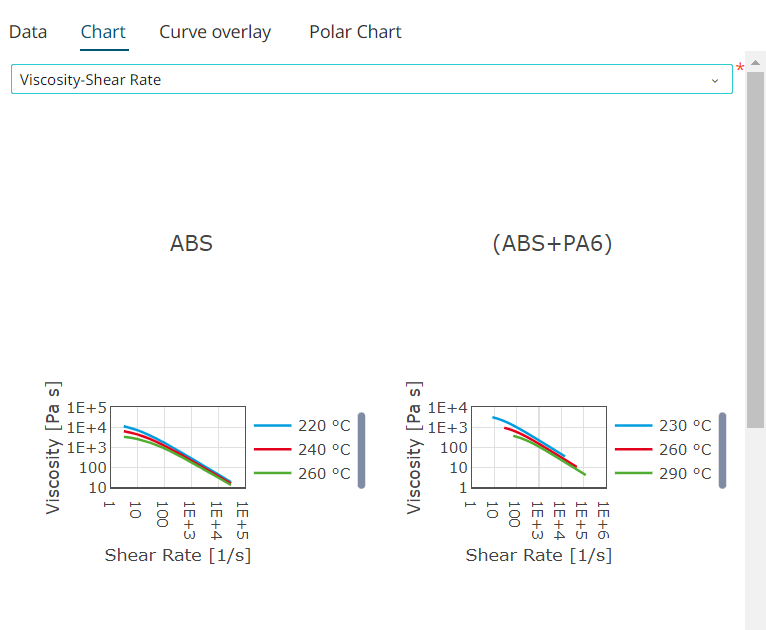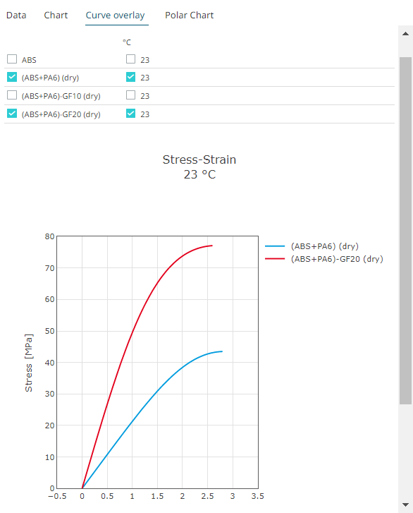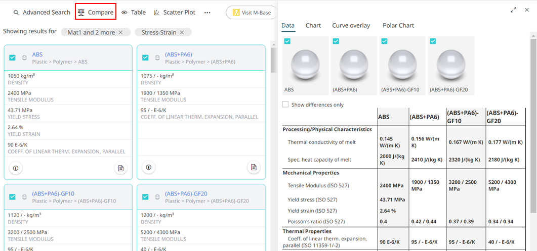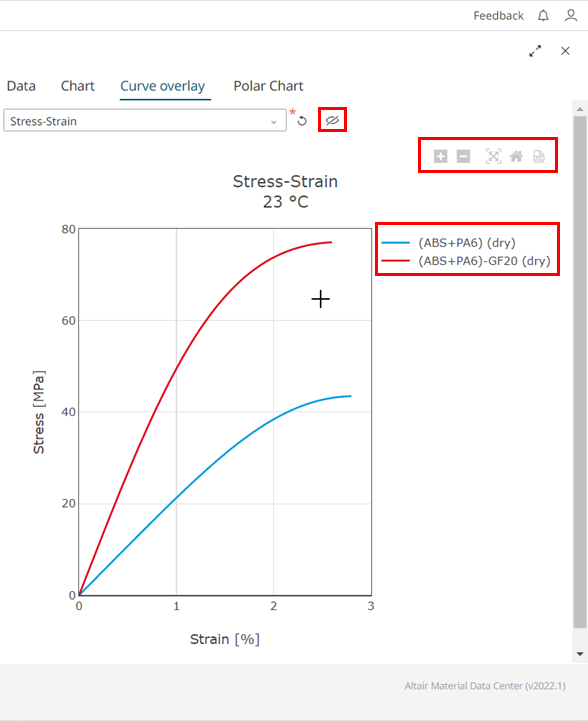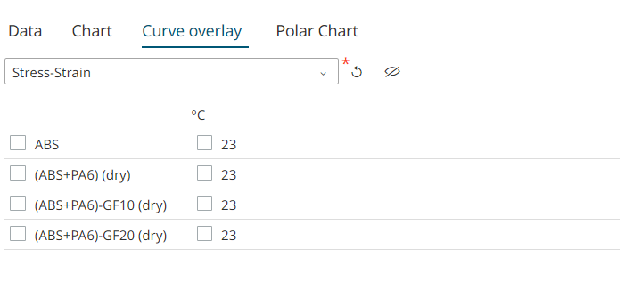 Compare materials data using the plot curve values. You can also overlay selected materials and check the curve values in a single plot axes.