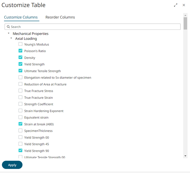 Figure 2. Customize Columns - Select the required material properties to be displayed as columns in the table view.