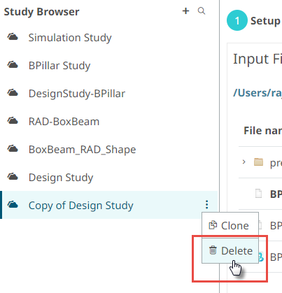 Delete a Study Remove a study if it is not required anymore. Select the study folder from the Study Browser. Figure 1. Study Browser Click Delete in the context menu. Figure 2. Delete a Study Folder The study folder is removed from the Study Browser.