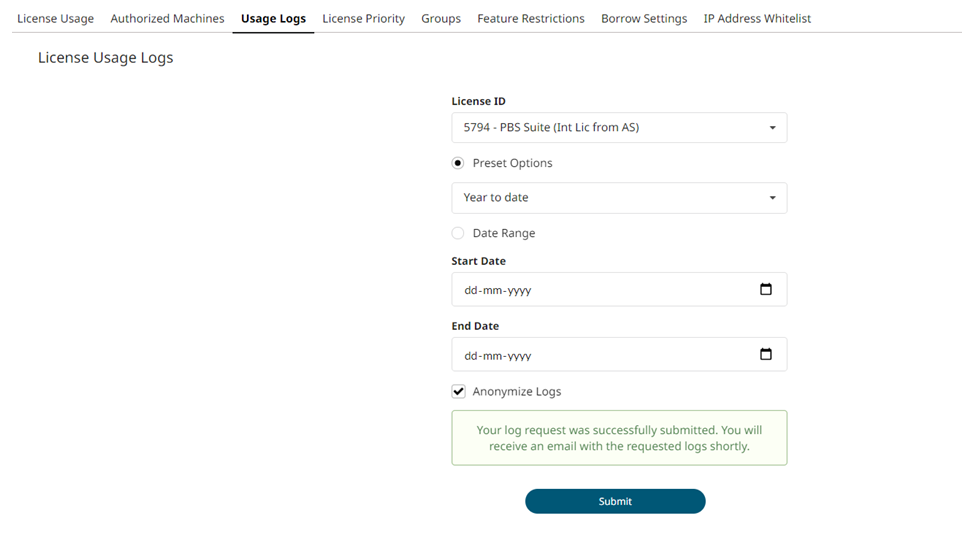 The License Usage Logs form is displayed.