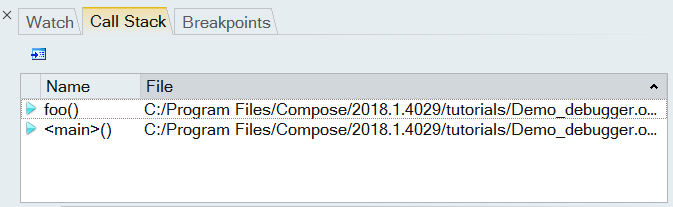 2. Click the Call Stack window tab. Investigate the contents inside the Call Stack window. The current execution point (line 20) is listed as well as the calling point to the function foo (line 34).