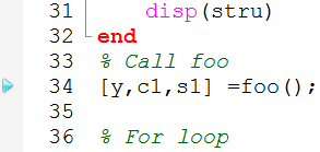 4. The blue arrow indicating the next line to be executed is now at line 34. Use Step Over, , to move the execution to the next line.