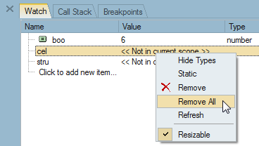 4. Right-click in the Watch window and select Remove All. Select Yes to the message that prompts if you want to delete all entries.