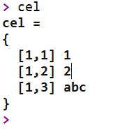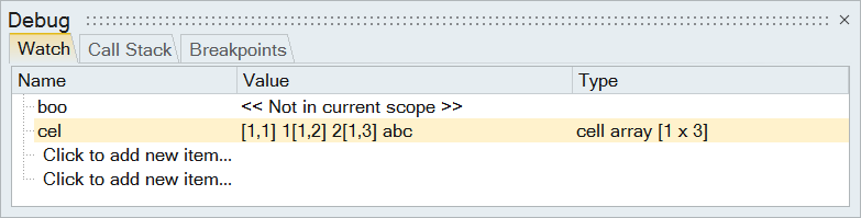The contents of the variable cel are updated in the Watch window. The Type column indicates that the variable cel is a cell and there are three elements in the cell. The values are listed in the Value column. You can also type cel in the OML Command Window to check the elements’ values: