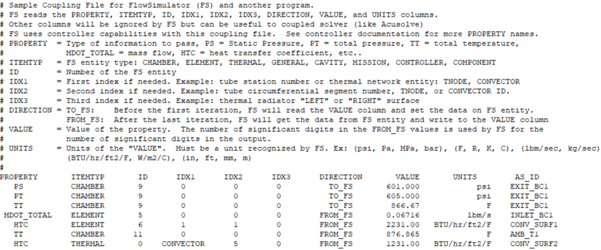 The DIRECTION column with “TO_FS” indicates the properties that are set at the beginning of the run and with the “FROM_FS” indicates properties retrieved from Flow Simulator at the end of the run. Flow Simulator will scale the VALUE based on the UNITS column. Flow Simulator will ignore any columns that it does not recognize. For example, the AS_ID column could be used by the other solver to identify a boundary condition input.