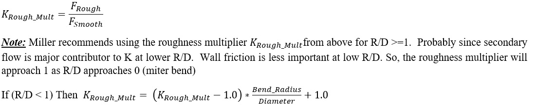 Correction that converts fully turbulent K-loss from experimental data into physical K-loss that occurs for high Reynolds numbers (and depends on Bend Radius / Pipe Diameter). 0: None 2: Bend Radius / Pipe Diameter = [Fig. 9.3 in (Miller, 1990) 2nd Ed.] 3 Bend Radius / Pipe Diameter > 2 [Fig. 9.3 in (Miller, 1990) 2nd Ed.] |