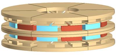 This case of study is devoted to the magneto-thermal modeling of an axial flux machine with one internal rotor and two external stators. Geometry, meshing, physics definition and solving will be automatically carried out by dedicated set of macros which takes as inputs the material properties and the geometrical features of the machine. |