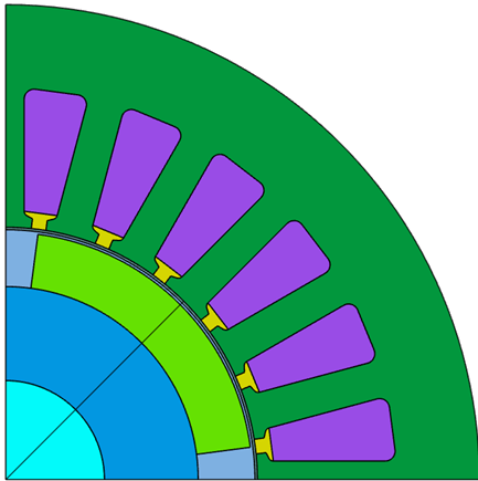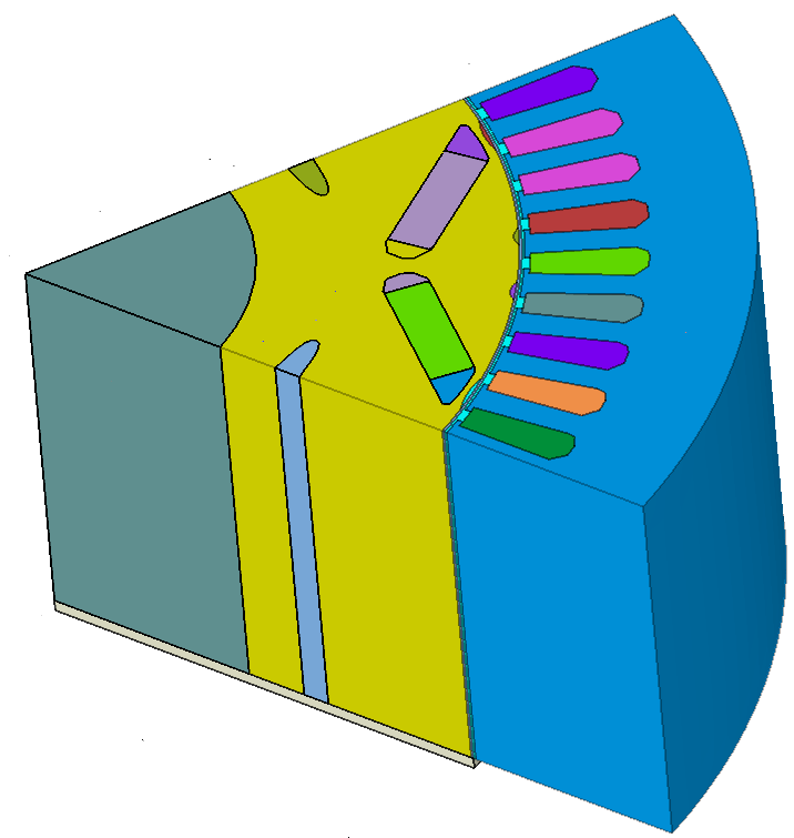 The 3D studied device, the Tesla Model 3's electric motor, includes the following elements: • a fixed part (stator) including yoke, slots, and windings • an air gap • a movable part (rotor) with surfaced magnets |