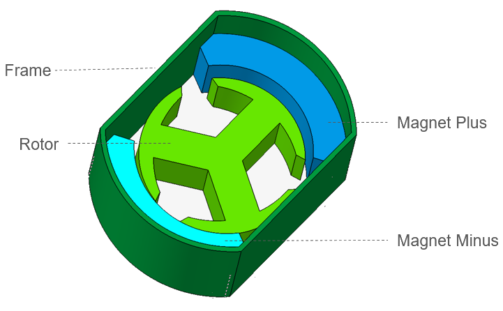 This tutorial illustrates a 3D model of a small permanent magnet motor, used to align the rear-view mirror of a car. The motor under study consists of four main parts: frame, permanent magnets, rotor and coils. |