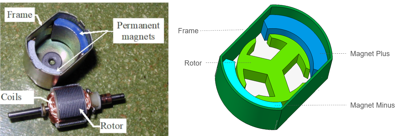 The device to be analyzed is a small permanent magnet motor, used to align the rear view mirror of a car. The motor under study consists of four main parts: frame, permanent magnets, rotor and coils.