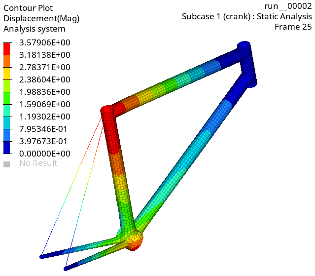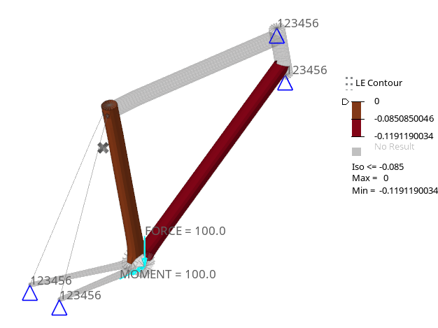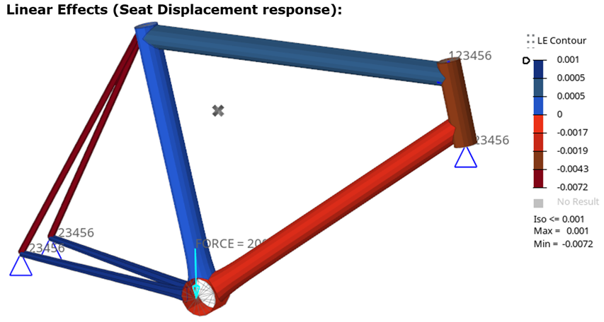 Figure 17.Note: Notice the negative correlation between the gauge design variables and the displacement response. This indicates that an increase in the gauge of the component will result in a corresponding decrease to the displacement response. In addition, the relative effect of a change to the down tube thickness will be greater than a similar change to the seat tube thickness.In addition, the effects contour is mapped onto the model itself in the graphics area for visualization.
