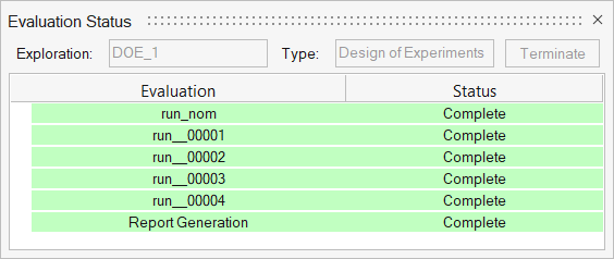 The DOE is evaluated. In this case, there will be a nominal run plus four DOE runs.