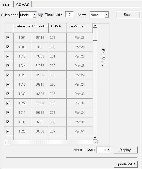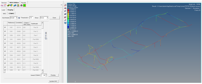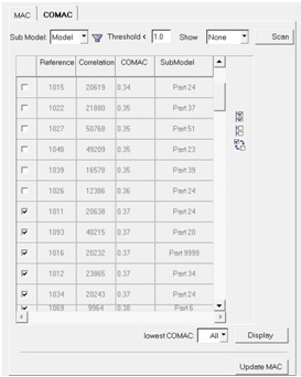 MACに対する節点の感度は、CoMAC値の低い節点を除外することによって検討できます。これは、CoMAC節点テーブルで個々の節点を選択解除するか、サブモデルフィルターを使用してフィルタリングすることで実行できます。出力されるMACは、計算されて元のMACと比較されます。