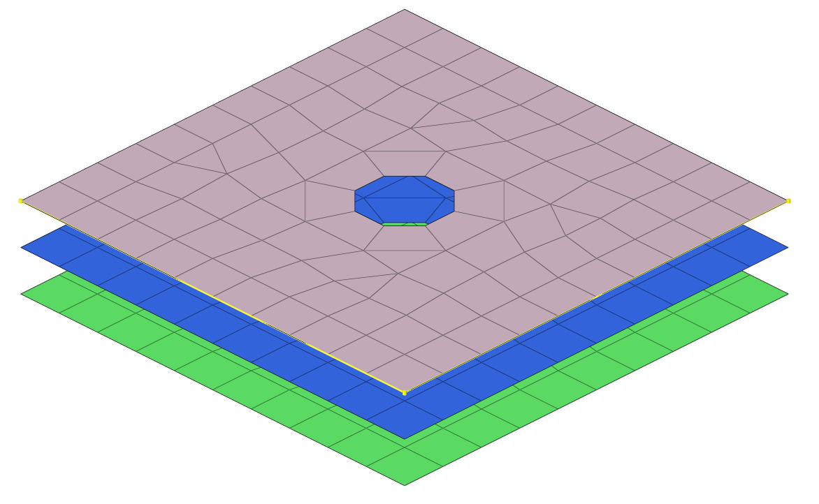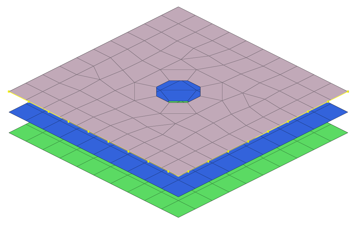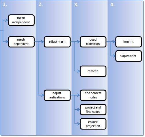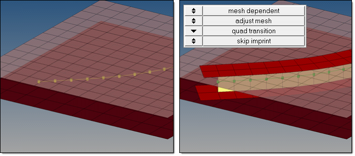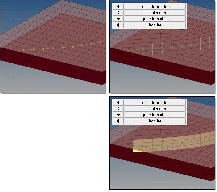 - 四角形要素の移行を伴うメッシュ依存のリアライゼーション作成時、複数のコネクターセットのそれぞれの間隔が近すぎる場合、四角形要素の移行メッシュが重なり合ったり、互いに緩衝し合ったりすることがあります。imprintオプションは、相互の移行などを調整し、基底にあるメッシュを結果に合わせて修正して、シームレスかつ適切にメッシュされた最終結果を作成します。