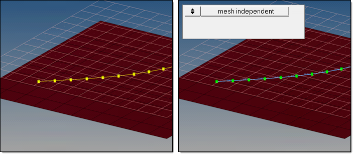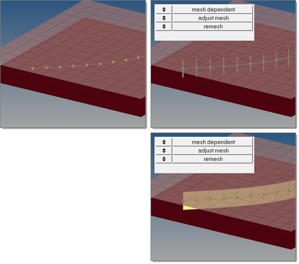 - 投影ラインの周囲に完全な形状の四角形要素が作成されます。四角形要素のサイズはメッシュサイズの平均で定義されます。1つのプロジェクションポイントから次の完全な一組の要素から作成されます。また、このオプションを使用し、四角形要素からもラインが作成でき、完璧にモデル化されたTエッジを通してリンクする結合をリアライズできます。
