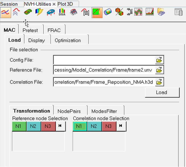 MACユーティリティのLoadタブでは、参照および相関ファイルを選択して読み込み、MAC解析用にモデルファイルを定義できます。