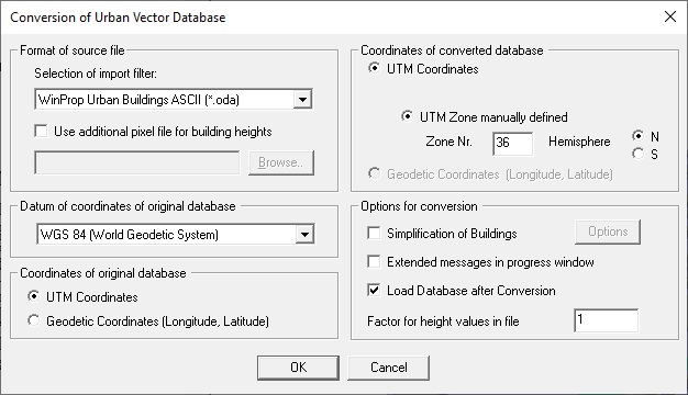 The import functions can be activated by the Convert Urban Database option of the File menu. Then the user must select the specific format of interest. For the import of ARCVIEW™ Shapefiles in .shp format during the conversion, also the heights of the buildings in a .dbf file are required (located in the same folder as the .shp file). Therefore, this data should be provided also in the corresponding folder with the same file name before the suffix.